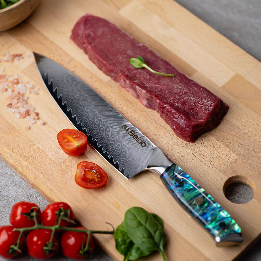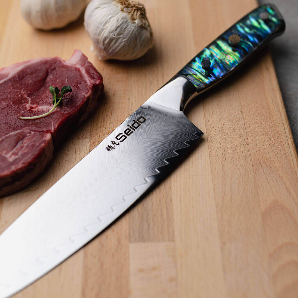 Made with a VG-10 Super Steel core and 67 layers of Damascus steel. This Japanese Gyuto Knife has an 8" / 205mm razor sharp blade and a distinct abalone shell resin handle.