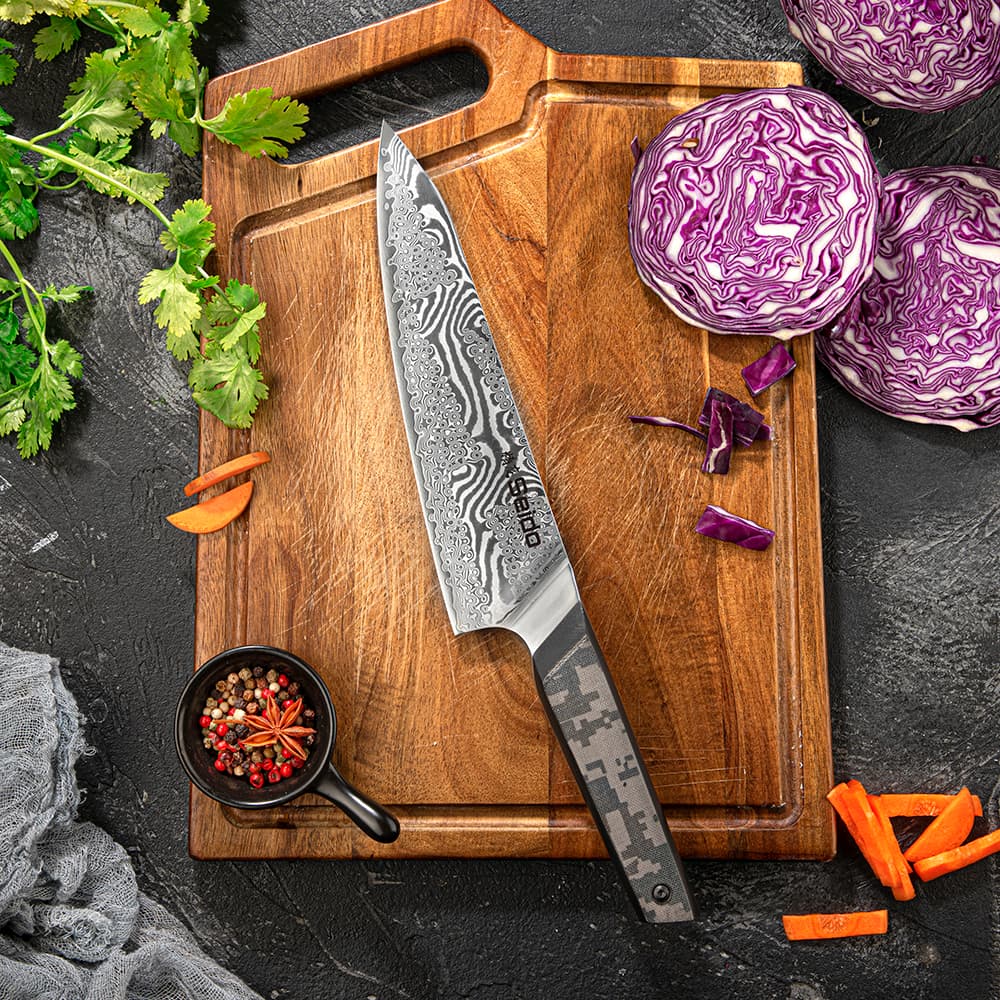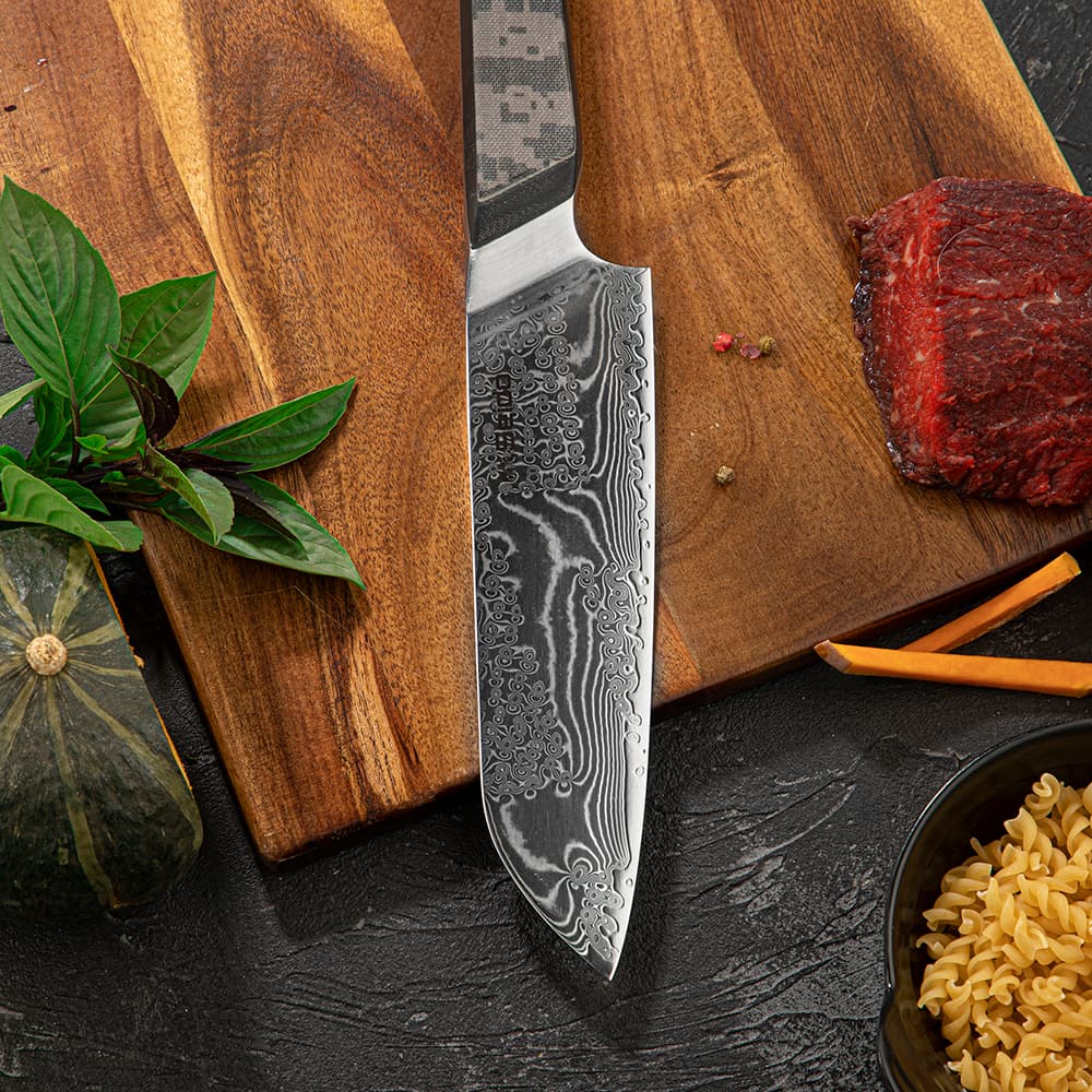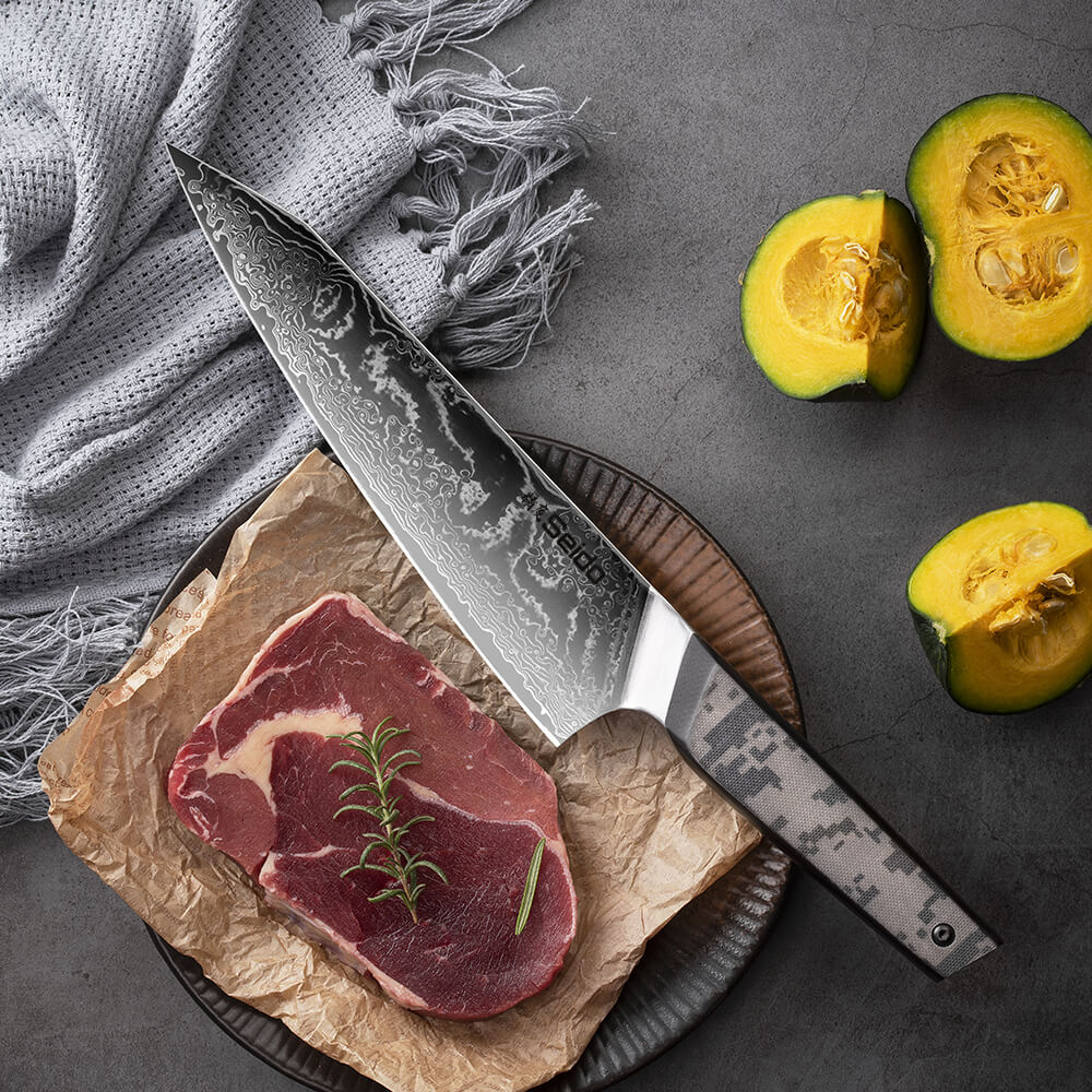 This five-piece Meisai chef knife set features 67 layers of pure Damascus steel and a VG-10 high carbon super steel core, granting it a 60 HRC toughness hardness rating and exceptional edge retention. Its double bevel blade is sharpened to 12°, enabling it to slice effortlessly through ingredients. Additionally, the camouflauge handle is made of G10+ high-pressure fiberglass, offering resilience and a lightweight feel for optimal performance.