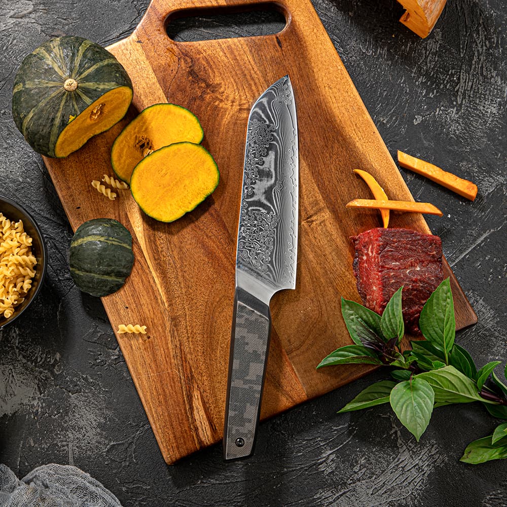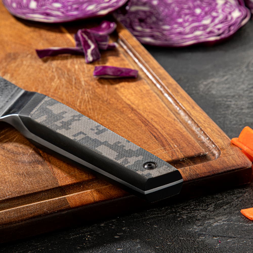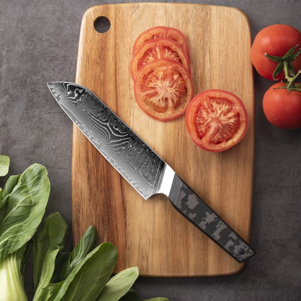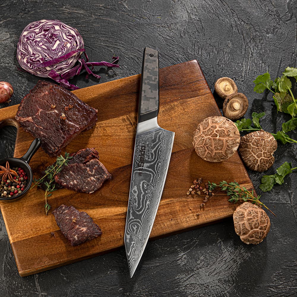 This five-piece Meisai chef knife set features 67 layers of pure Damascus steel and a VG-10 high carbon super steel core, granting it a 60 HRC toughness hardness rating and exceptional edge retention. Its double bevel blade is sharpened to 12°, enabling it to slice effortlessly through ingredients. Additionally, the camouflauge handle is made of G10+ high-pressure fiberglass, offering resilience and a lightweight feel for optimal performance.